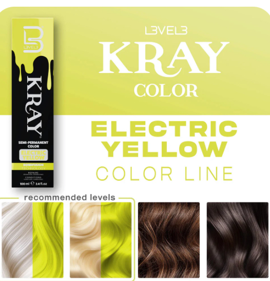 - Apply Color: On dry hair, apply the L3VEL3 KRAY Semi-Permanent Color Electric Yellow directly to the hair without using an oxidant.