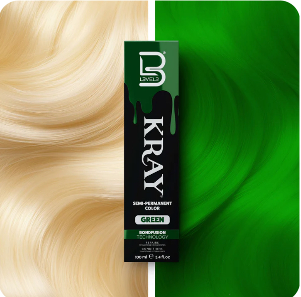 - Apply Color: On dry hair, apply the L3VEL3 KRAY Semi-Permanent Color Green directly to the hair without using an oxidant.